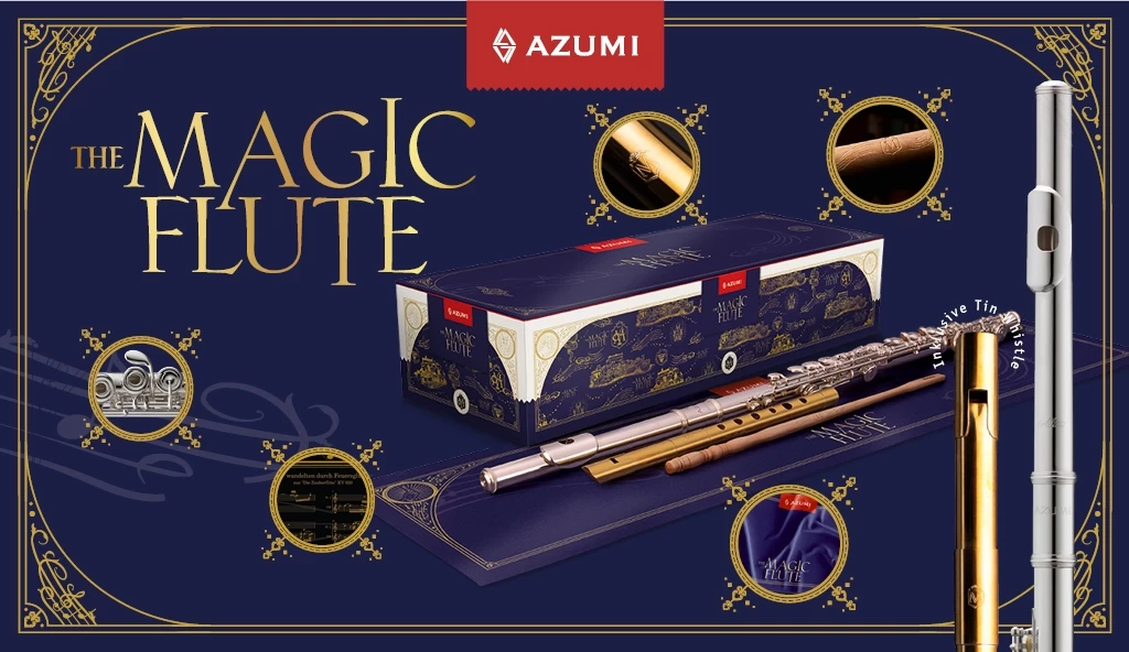 In Kooperation mit dem Kinofilm „The Magic Flute“ hat AZUMI eine hochwertige, aufwändig gestaltete und sehr stabile Geschenk- und Sammler-Box entwickelt. Sie bietet Platz für eine der AZUMI Querflöten-Modelle der Z2-Serie, inklusive Flötenetui und Tasche sowie einem eingearbeiteten Geheimfach für eine zusätzliche exklusiv im „The Magic Flute“ Look gravierte Tin Whistle aus Messing und weiteren wertvollen Beigaben.