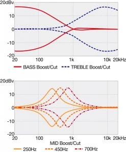 - Regler: Master Volume – Pan (Pickup) – Treble Boost/Cut – Midrange Boost/Cut – Bass Boost/Cut – Passive Tone – Active/Passive Mini-Switch