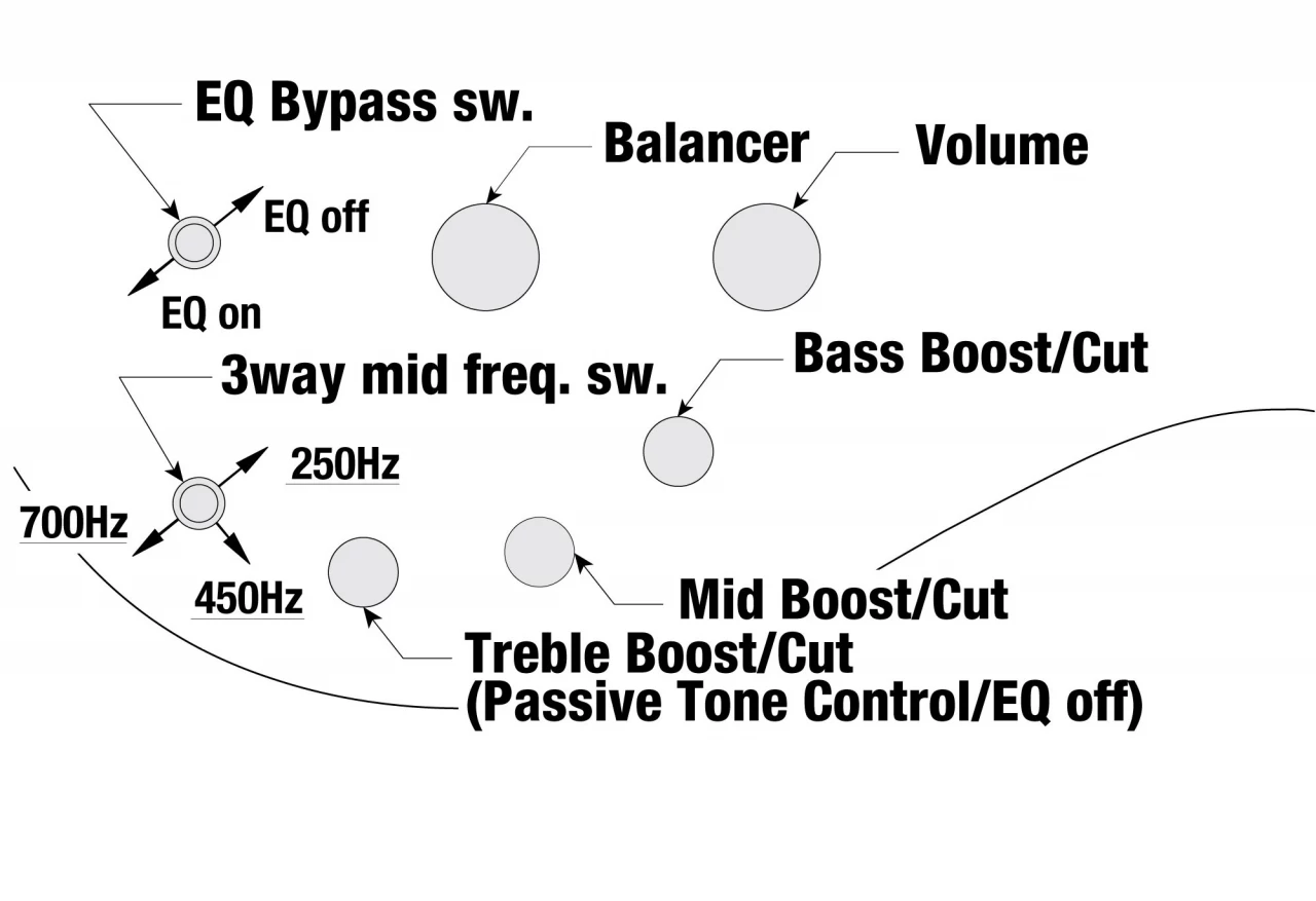 - Elektronik: Ibanez Custom Electronics 3-Band EQ – mit Mid-Frequency und EQ Bypass Switch